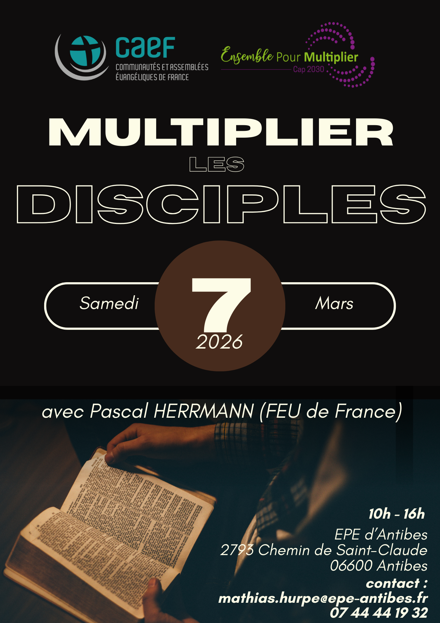 Rencontre inter eglises le samedi 7 mars 2026 à l’EPE d’Antibes (Centre commercial Galaxie, 2793 Chem. de Saint-Claude, 06600 Antibes) sur le thème : » Multiplier les disciples ! »